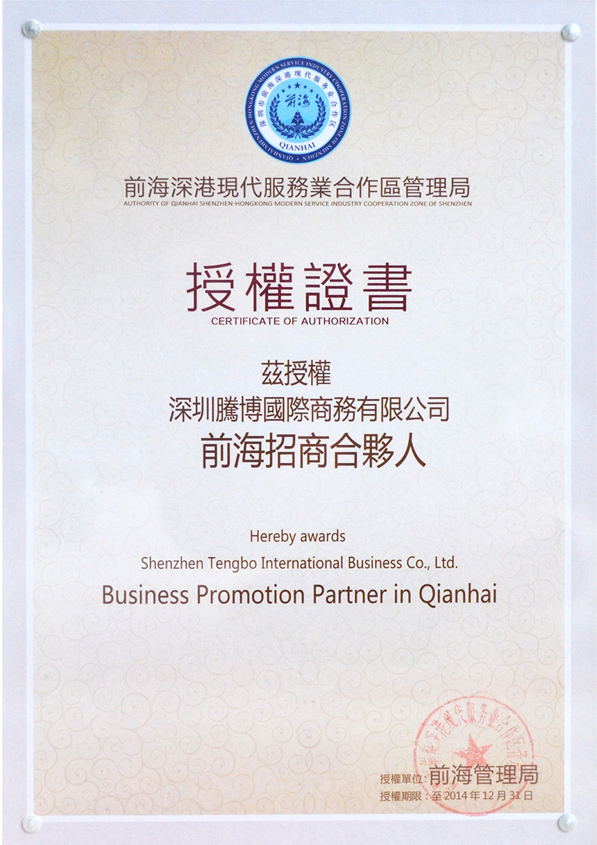 自成立以来,腾博是深圳市商业联合会的理事成员,前海招商合伙人,独享资源和绿色通道,首家经深圳前海深港现代化服务业合作区授权认定的 “前海优秀招商合伙人”,拥有多条绿色快速通道、独享最前沿的前海资讯、最独到的政策解读,致力于协助企业入驻前海减低营运成本,在竞争激烈的环境中取得优势。腾博拥有丰富的价值沉淀与社会资源,并一直遵循专业态度与卓越服务准则,致力为政府、企业及个人提 供个性化定制解决方案,在专业领域具有卓越表现作出重大贡献。截至目前,已成功为超10万+家企业及个人提供优质的金融与商务服务。