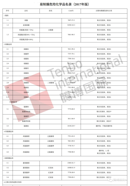 《易制爆风险化学品名录》(2017版)将易制爆危险化学品分为酸类、硝酸盐类、氯酸盐类、高氯酸盐类、重铬酸盐类、过氧化物和超氧化物类、易燃物还原剂类、硝基化合物类以及其他九类。比较常见的易制爆化学品有:氯酸钾、高氯酸钾、高氯酸铵、氯酸钠、硝酸钾、硝酸钠、硝酸铵、硝化棉等。(了解更多易制爆危险化学品类别,可咨询腾博国际:13168755330)